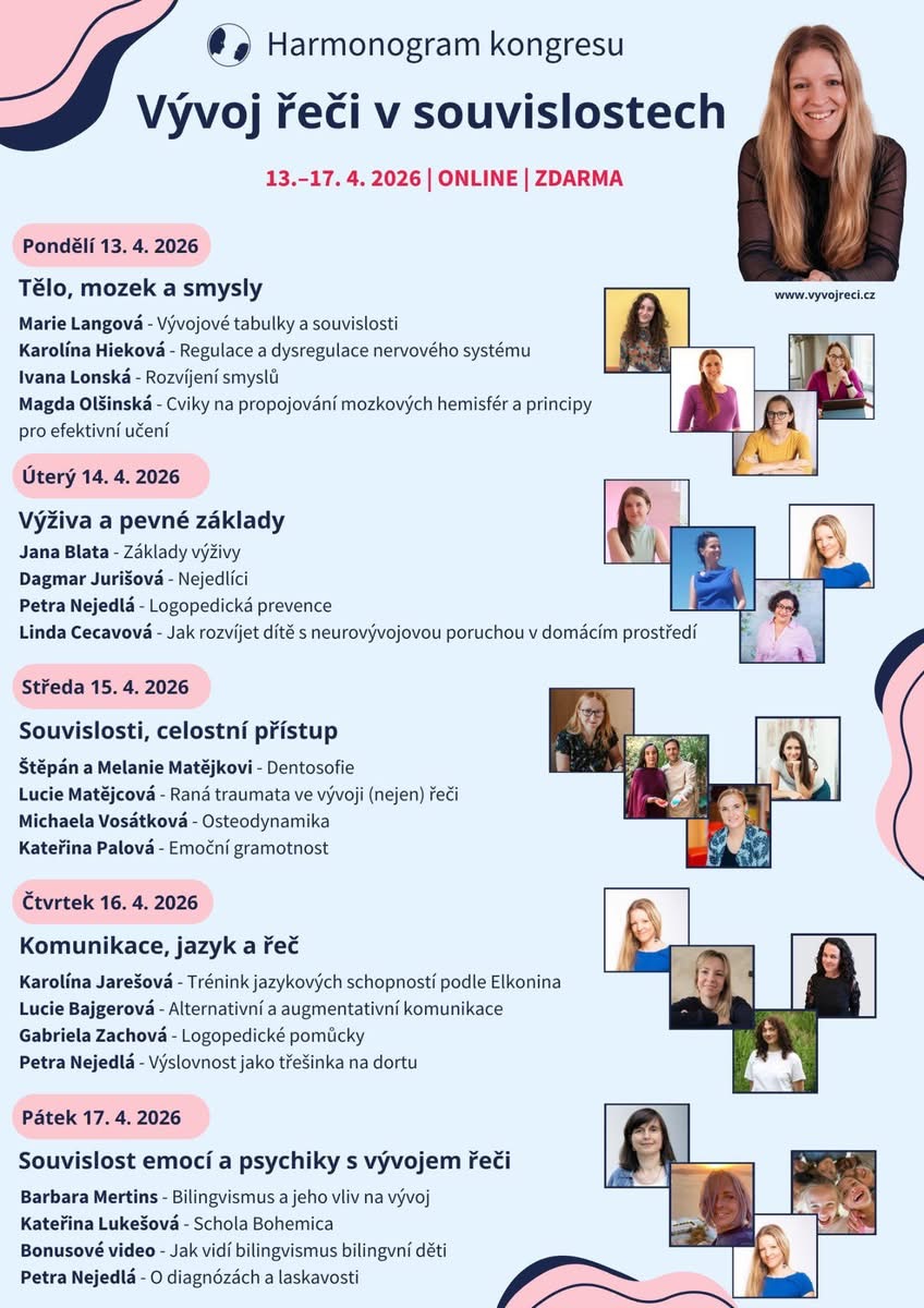 moc ráda bych Vás pozvala na kongres Vývoj řeči v souvislostech paní Mgr. Petry Nejedlé, kterého jsem letos také součástí. Kongres bude probíhat 13.-17.4.2026 online a je po dobu těchto dní zcela zdarma, stačí se jen přihlásit.Jako pokaždé bude plný inspirativních témat týkajících se (nejen) vývoje řeči. Rozhovor se mnou bude na velmi zajímavé a v naší republice zatím méně známé téma Raná traumata (nejen) ve vývoji řeči.